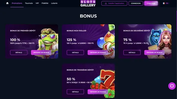 Si vous recherchez un bonus sans dépôt du casino SlotsGallery, veuillez noter que nous n’affichons pas de récompense sans dépôt pour la France pour le moment. Lorsque nous organisons des événements spéciaux, nous les affichons directement dans votre espace promotions, avec les conditions complètes et l’éligibilité. Il en va de même si vous cherchez plus tard dans l’année un deuxième bonus sans dépôt du casino SlotsGallery : vérifiez toujours sur notre site avant de planifier votre jeu.