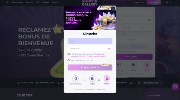 La création d’un compte chez SlotsGallery est conçue pour être rapide, tout en collectant les informations nécessaires aux paiements et à la vérification. Vous pouvez commencer depuis n’importe quelle page via le bouton d’inscription en haut du site. Après inscription, vous pouvez déposer en EUR à partir de 20 EUR via cartes, vouchers, portefeuilles électroniques ou crypto. Si vous avez déjà un compte, la connexion SlotsGallery est disponible depuis le même menu supérieur.